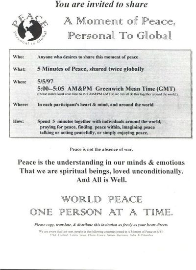 I organized the first Peace Moment to take place on August 13, 1996. I wrote to the largest newspaper in 110 countries of the world. I heard back from two, with one, in Latvia actually sending me what they had printed. I also wrote to world personalities whom I thought would be supportive. I knew Coretta Scott King,, and she was immediately supportive. I also received letters from Mother Theresa of Calcutta and Mr (Fred) Rogers, who offered their support.